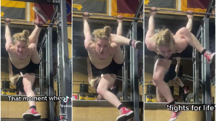 Le défi était le suivant: en étant suspendu dans les airs à une barre, il fallait effectuer une roulade arrière tout en faisant revenir ses jambes au-dessus de la tête. Easy, non?